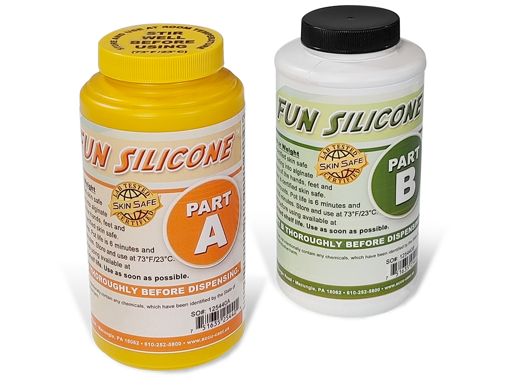 Accu-Cast™ FUN Silicone™ is a soft silicone rubber made especially for casting into alginate molds to make flexible, exact rubber reproductions of body parts. FUN Silicone™ is easy to use and cures to a strong rubber that is tear resistant and exhibits very low long term shrinkage.