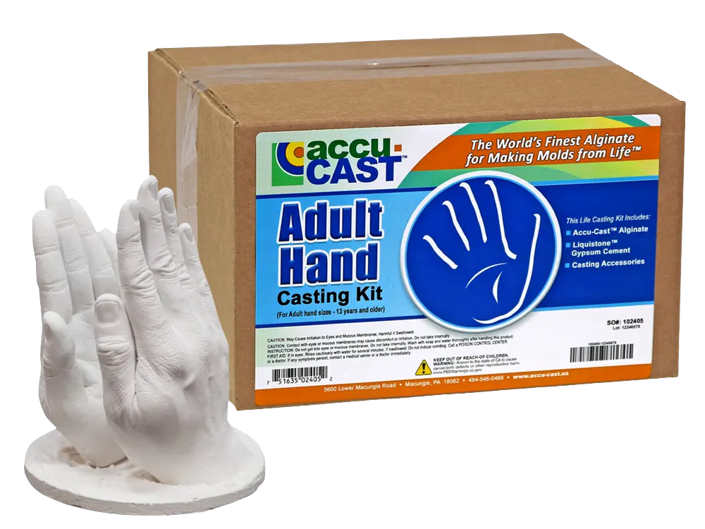 The Adult Hand Casting Kit allows you to create an amazingly detailed hard stone casting of up to two adult hands.
